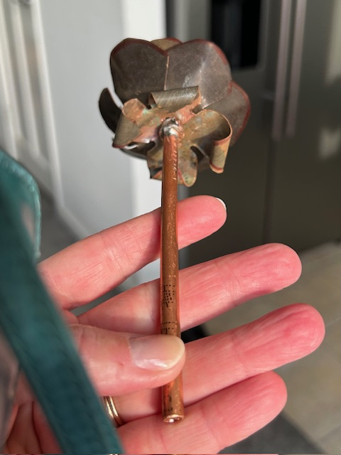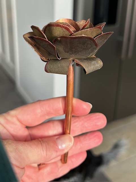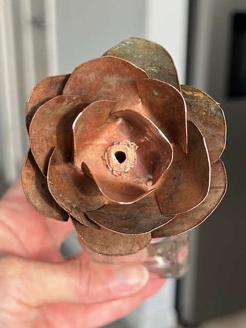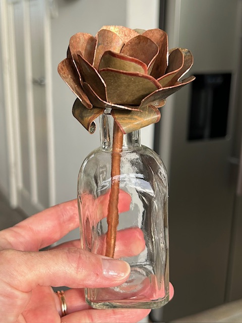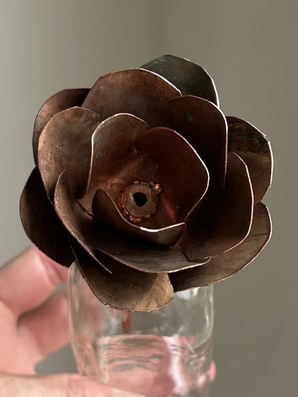 Artikelnummer: KRV005Roosje van doorleefd oud-Koper. Inclusief glazen flesje. Koperen steeltje 6mm. Voor speciale gelegenheden, mooi voor op tafel, de vensterbank, schouw of buiten. Het kan zowel buiten als binnen staan/liggen, buiten zal het koper na verloop van tijd zelfs vergroenen. Leuk om aan uw geliefde te geven of bijvoorbeeld bij een (koperen) bruiloft of als herinnering, blijft voor eeuwig. MetallicDream-creatie.