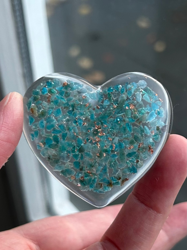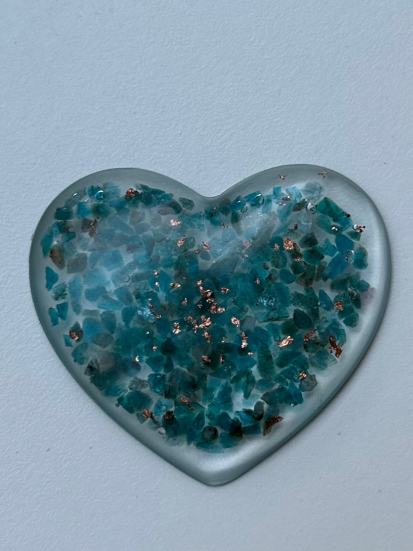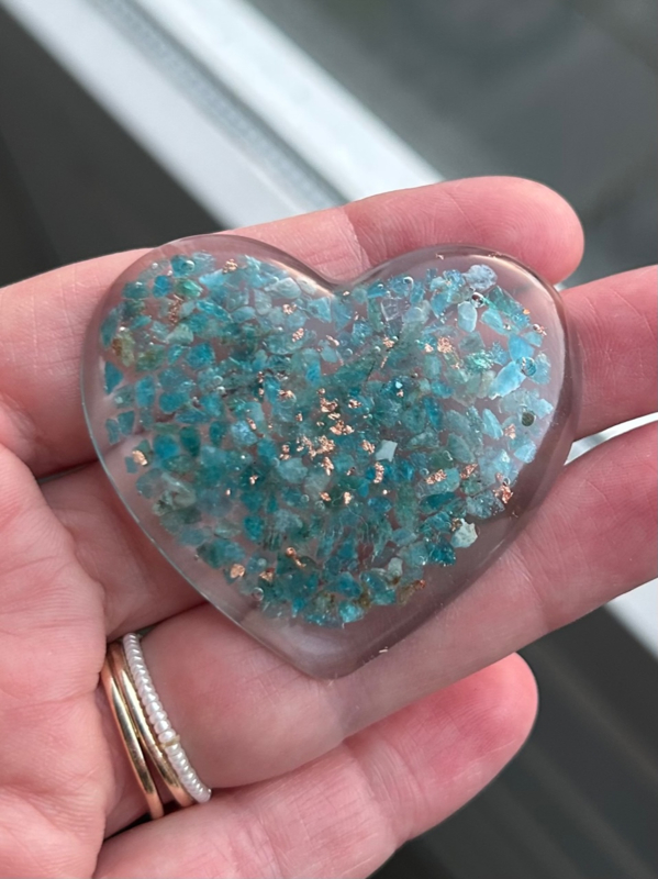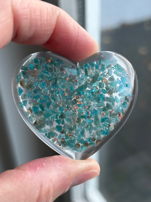 Artikelnummer: HoA005Mooi orgonite hartje met koperschaafsel. Iedere gieting is uniek. Dit artikel is handgemaakt, het kan iets afwijken van de foto en kan oneffenheden in de gieting bevatten. Orgonites stralen positieve energie uit. MarleenArt-creatie. De werking die aan Apatiet toegekend wordt: Stimuleert communicatie en zelfexpressie, maakt open, sociaal, levendig en werkt motiverend en activerend.