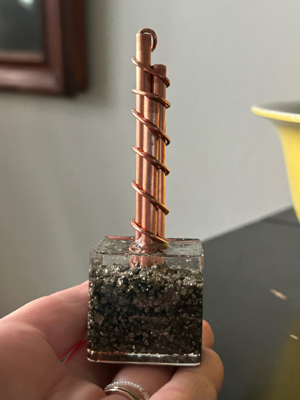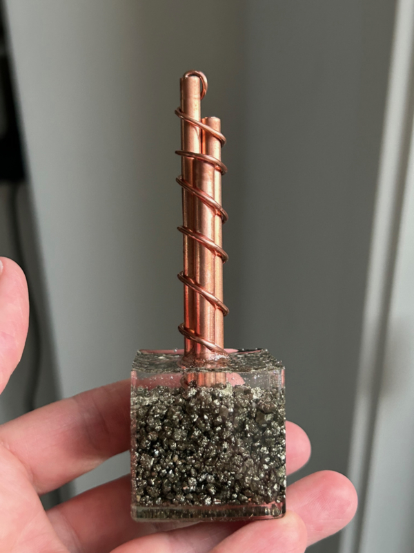 Artikelnummer: CHM040Deze mini Chembuster is voorzien van Pyriet, koperen buisjes, koperdraad en koperschaafsel. Dit artikel is handgemaakt, het kan iets afwijken van de foto en kan oneffenheden in de gieting bevatten. Chembuster-orgonites stralen positieve energie uit. Marleenart-creatie. De werking die aan Pyriet toegekend wordt: werkt positief op het vinden van geluk, is temperamentvol, brengt in beweging. Sterk aardende steen, bevordert wilskracht, zelfvertrouwen, eigenwaarde. Werkt als energieschild. Trekt positiviteit aan en maakt opgewekt.