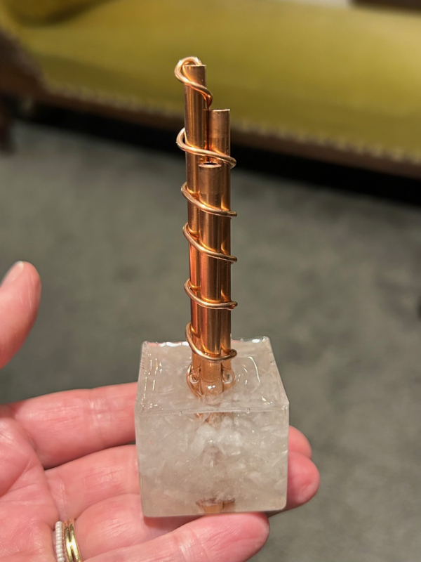 Artikelnummer: CHM010Deze mini Chembuster is voorzien van ruwe Bergkristal en koperen buisjes omwonden met koperdraad. Dit artikel is handgemaakt, het kan iets afwijken van de foto en kan oneffenheden en luchtbelletjes in de gieting bevatten. Chembuster-orgonites stralen positieve energie uit. Marleenart-creatie.